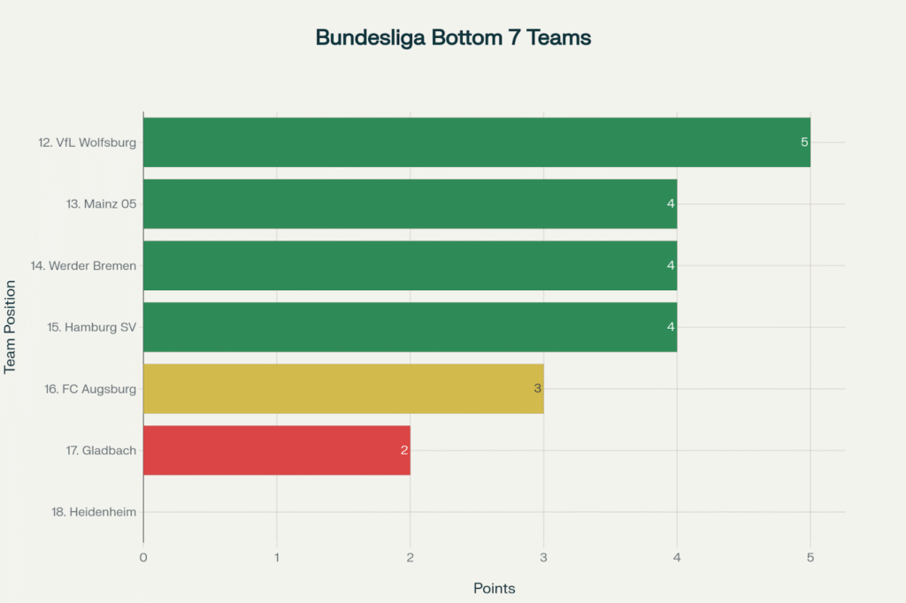 The Bundesliga table reveals the precarious nature of Augsburg’s position. They sit just one point behind Hamburg SV and Werder Bremen in the safety positions, whilst bottom-placed Heidenheim remains pointless after four matches. This tight clustering suggests that a few positive results could quickly lift Augsburg out of danger, but equally, another poor performance could see them slip into the automatic relegation spots.
