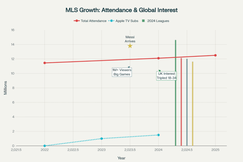 The financial implications are equally impressive. MLS attendance reached 12.1 million in 2024, surpassing three major European leagues including the Bundesliga (12.0 million), Serie A (11.6 million), and La Liga (10.7 million). Only the Premier League’s 14.6 million exceeded MLS’s total, highlighting American football’s remarkable growth trajectory.